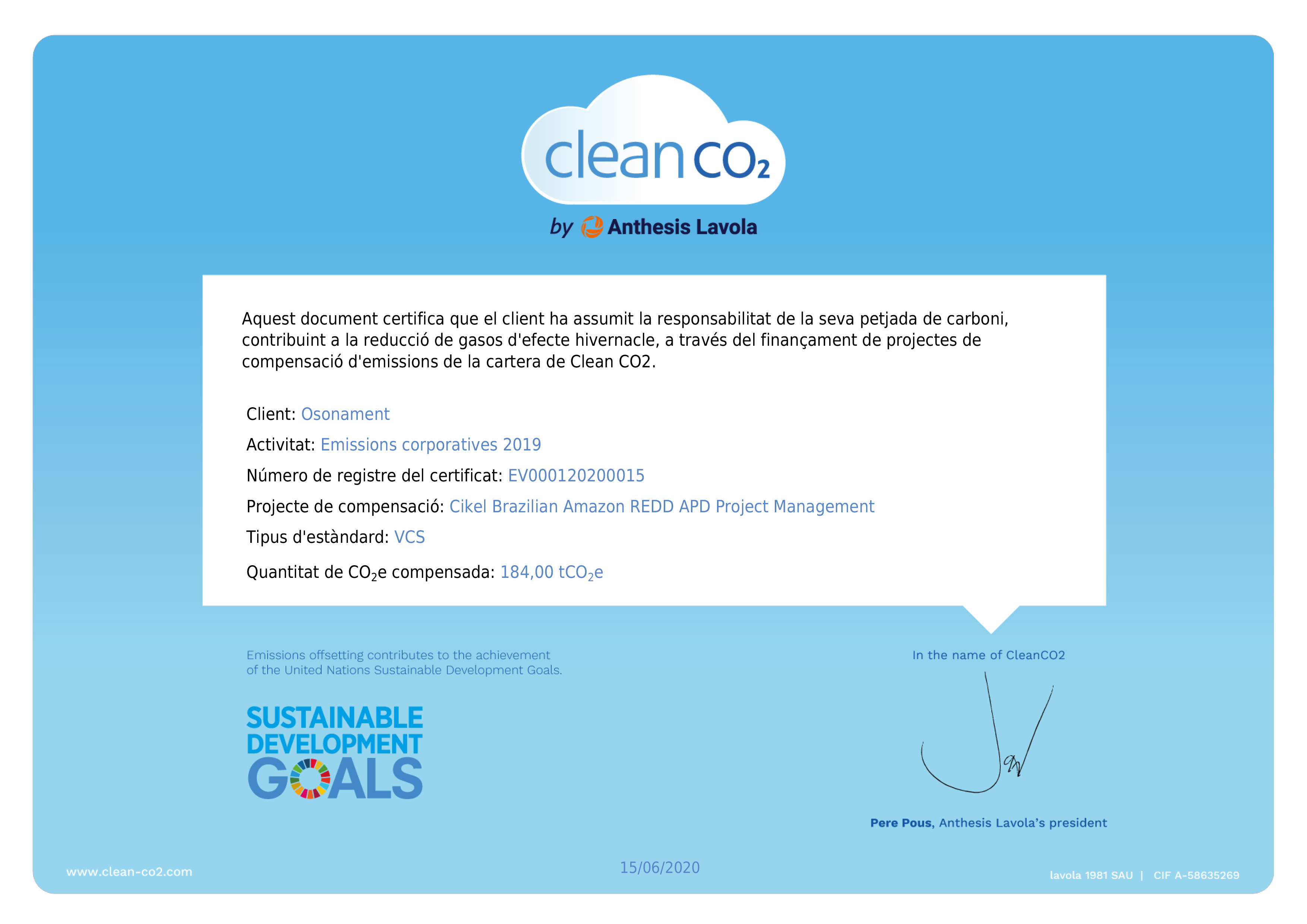 Osonament també va decidir adherir-se l’any 2018 al Programa d’Acords Voluntaris de l’Oficina Catalana de Canvi Climàtic, comprometent-se així a presentar anualment el seu inventari d’emissions i definint propostes per reduir les seves emissions.