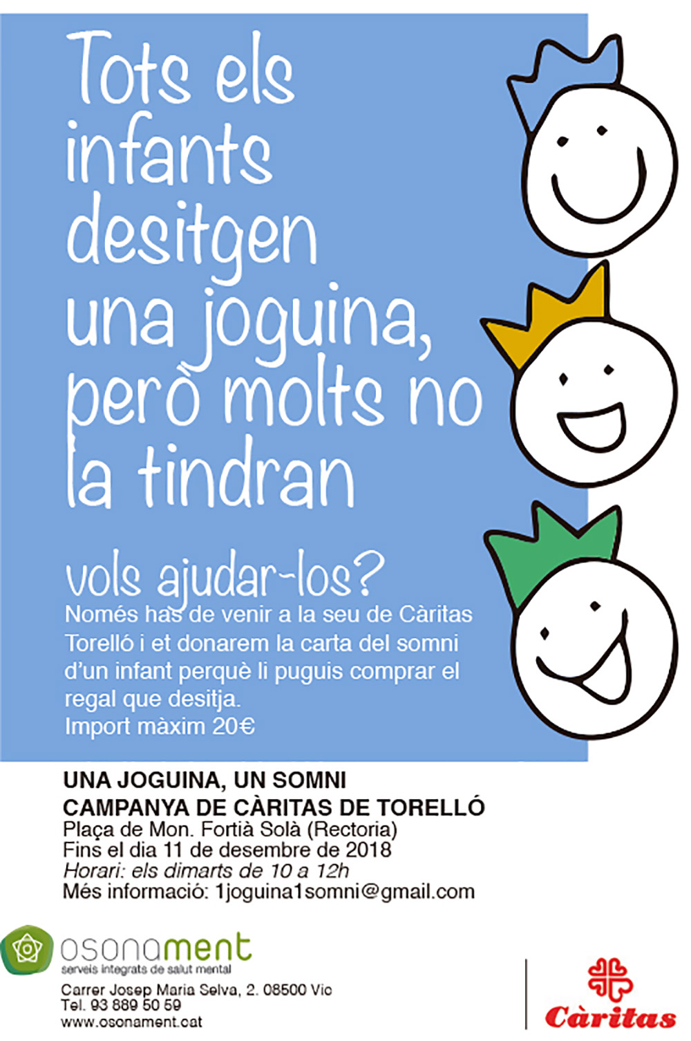 Per cinquè any consecutiu, Osonament col·labora amb Càritas de Torelló per impulsar la campanya ‘Una joguina, un somni”, perquè cap infant del municipi es quedi sense joguina durant les festes de Nadal. Les persones que vulguin col·laborar, poden recollir… Continue Reading →