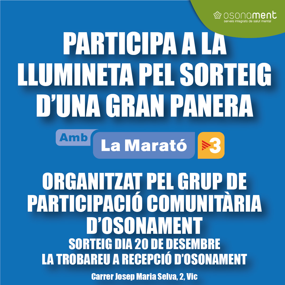 El grup de Participació Comunitària d’Osonament, format per persones ateses a l’entitat, s’ha proposat fer la seva aportació a la Marató de TV3, que enguany es centra en la campanya de recerca del càncer. Per això, està organitzant el sorteig… Continue Reading →