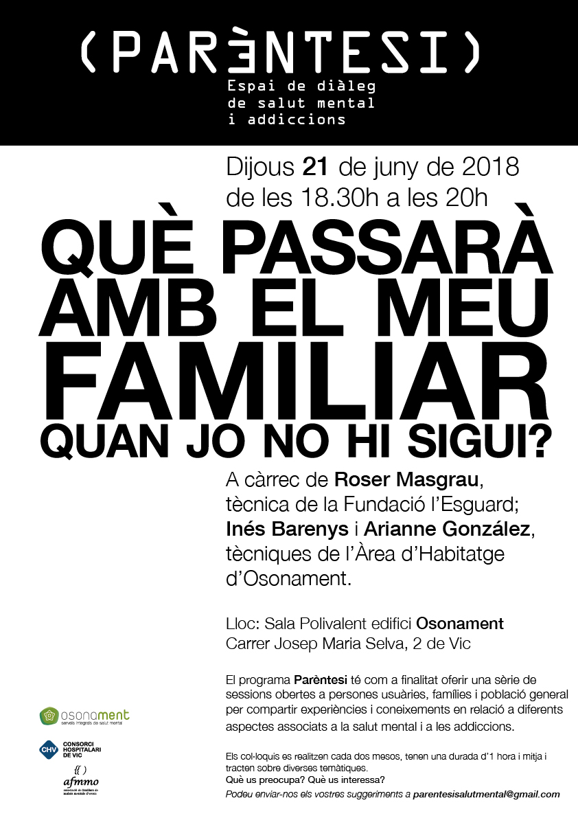Dues professionals d’Osonament, Inés Barenys i Arianne González, juntament amb Roser Masgrau, seran les encarregades de conduir la propera sessió de Parèntesi, el dijous 21 de juny a les 18.30h a Osonament. La sessió porta per títol “Què passarà amb… Continue Reading →