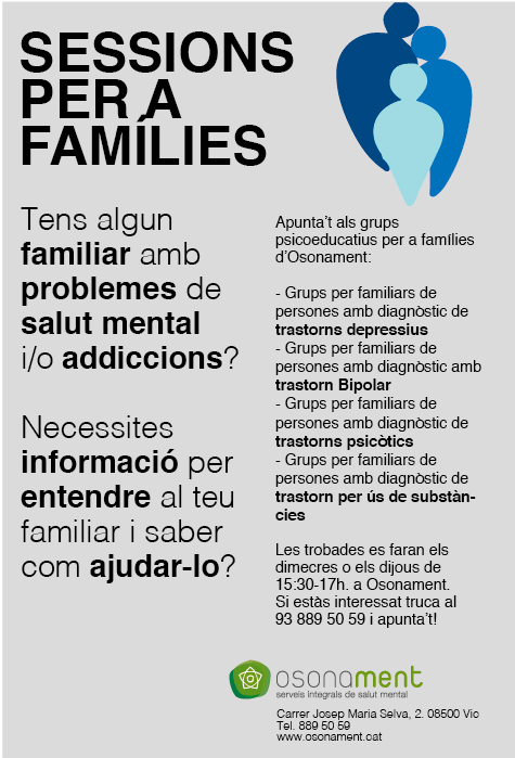 A principis de 2018 encetarem un programa dedicat especialment a les famílies de persones amb trastorns depressius, Trastorn Bipolar, trastorns psicòtics i trastorns per ús de substàncies. Si ets un familiar d”una persona amb diagnòstic de salut mental i vols… Continue Reading →