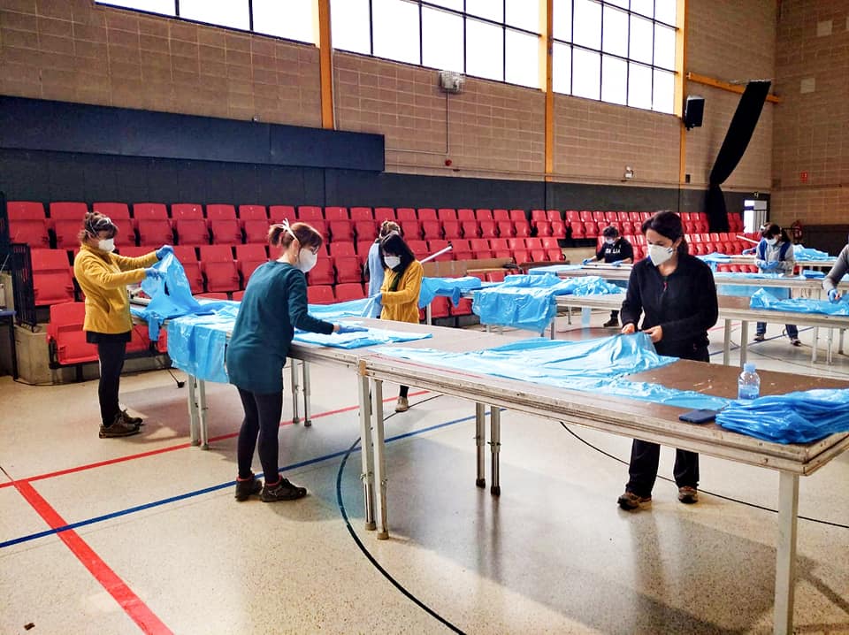 Professionals d’Osonament ajuden de forma voluntària a confeccionar les bates sanitàries de plàstic que aquests dies s’estan fabricant al pavelló de Gurb, gràcies a un conveni signat amb l’Ajuntament d’aquest municipi. Les 2.000 bates que s’hi fabriquen cada dia es destinen a hospitals, CAP, residències i altres centres d’Osona. Aquesta iniciativa de l’ajuntament de Gurb i Casa Tarradellas (que hi aporta material i maquinària), també compta amb la col·laboració d’altres ajuntaments i el consell comarcal d’Osona.