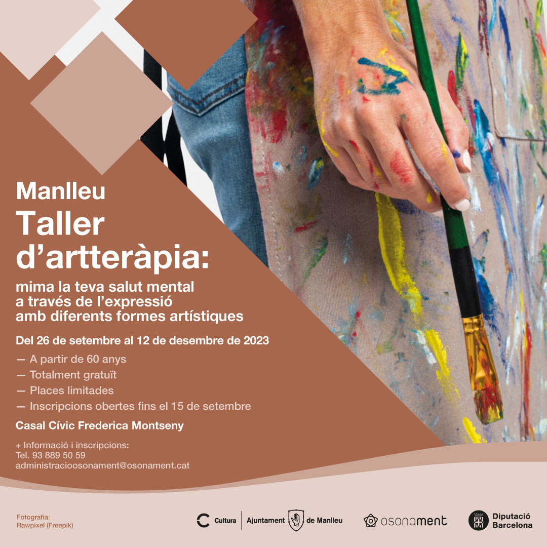 L’Ajuntament de Manlleu i Osonament organitzen, a partir de setembre, un taller d’artteràpia adreçat a persones vinculades a Osonament que visquin a la capital del Ter o a la seva àrea d’influència, que siguin majors de 60 anys i que estiguin interessades en activitats artístiques. També està obert a d’altres persones de la comunitat que compleixin aquests criteris.